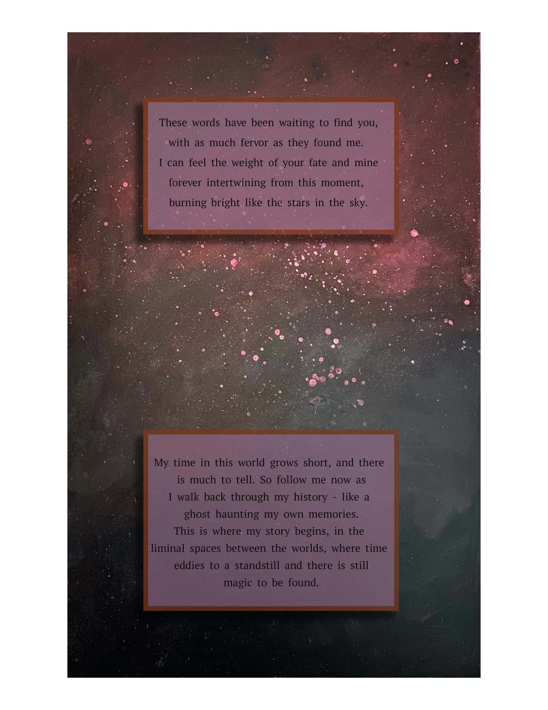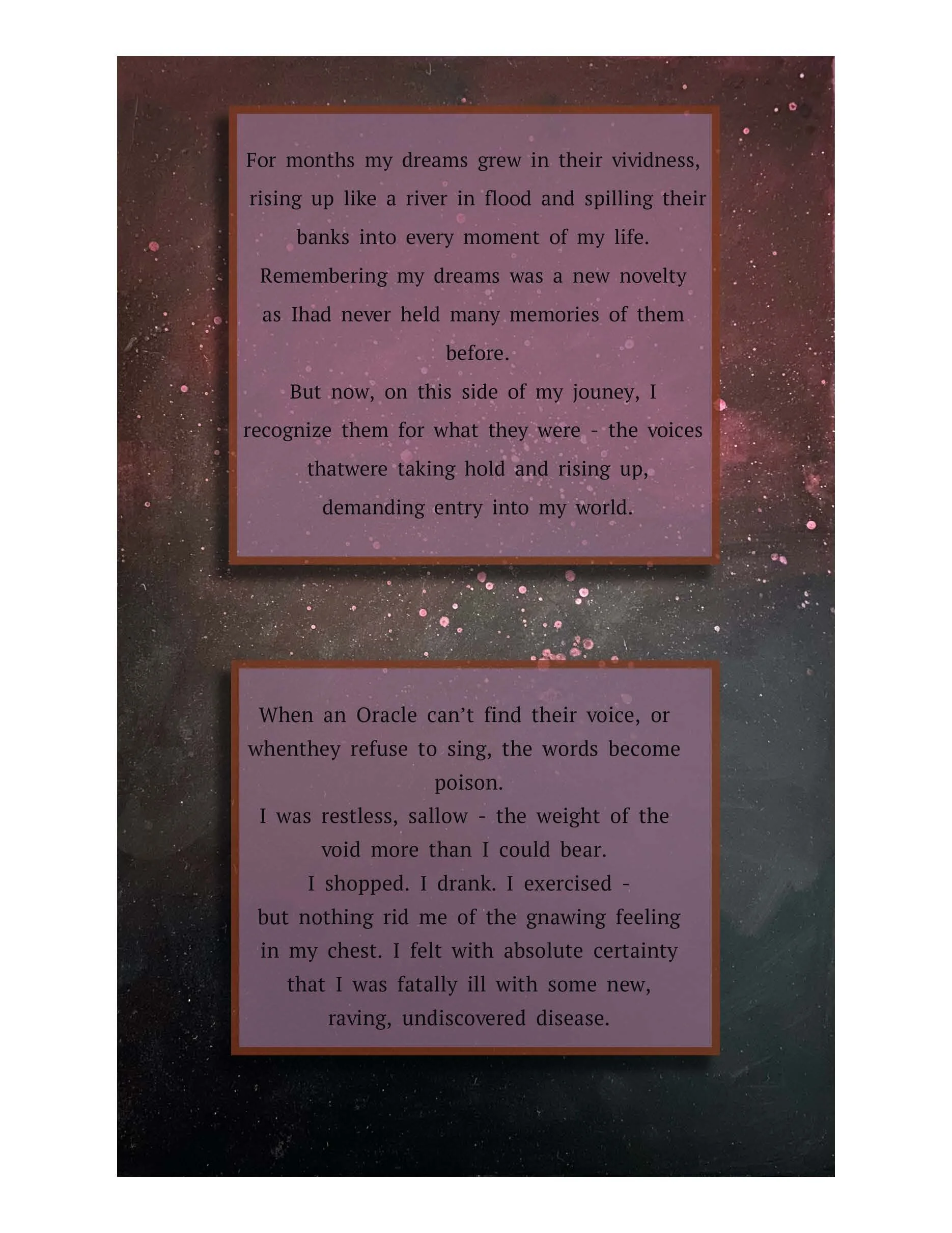 Oracle is the story of Asteria Blackwell, who is an oracle and must work to find her voice before her memories are devoured by dark creatures called memory eaters. She must journey into strange forests to learn to hear and trust her own voice in whatever shape it takes. She is tasked with the heavy duty of remembering the stories of those who have been forgotten by time.
